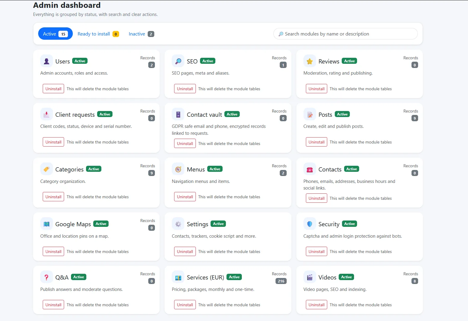 Част от модулите са напълно общи, например блог, страници контакти, услуги, портфолио. Други са изцяло специфични писани за конкретен клиент или вътрешна система. И в двата случая логиката е една и съща, модулът идва със свои таблици, изгледи и права за достъп.